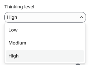 High (高):深度推理模式 (Deep Think Mini),思考 Token 预算最高,适合专业复杂任务。模型会激活类似 “Deep Think” 的强大推理引擎,进行极其深入的多步骤思考,以达到最佳效果。虽然成本比中低档位高,但相比上一代的 Deep Think 模式,同等深度下成本降低了约 30%——因为架构优化了,钱花得更值。