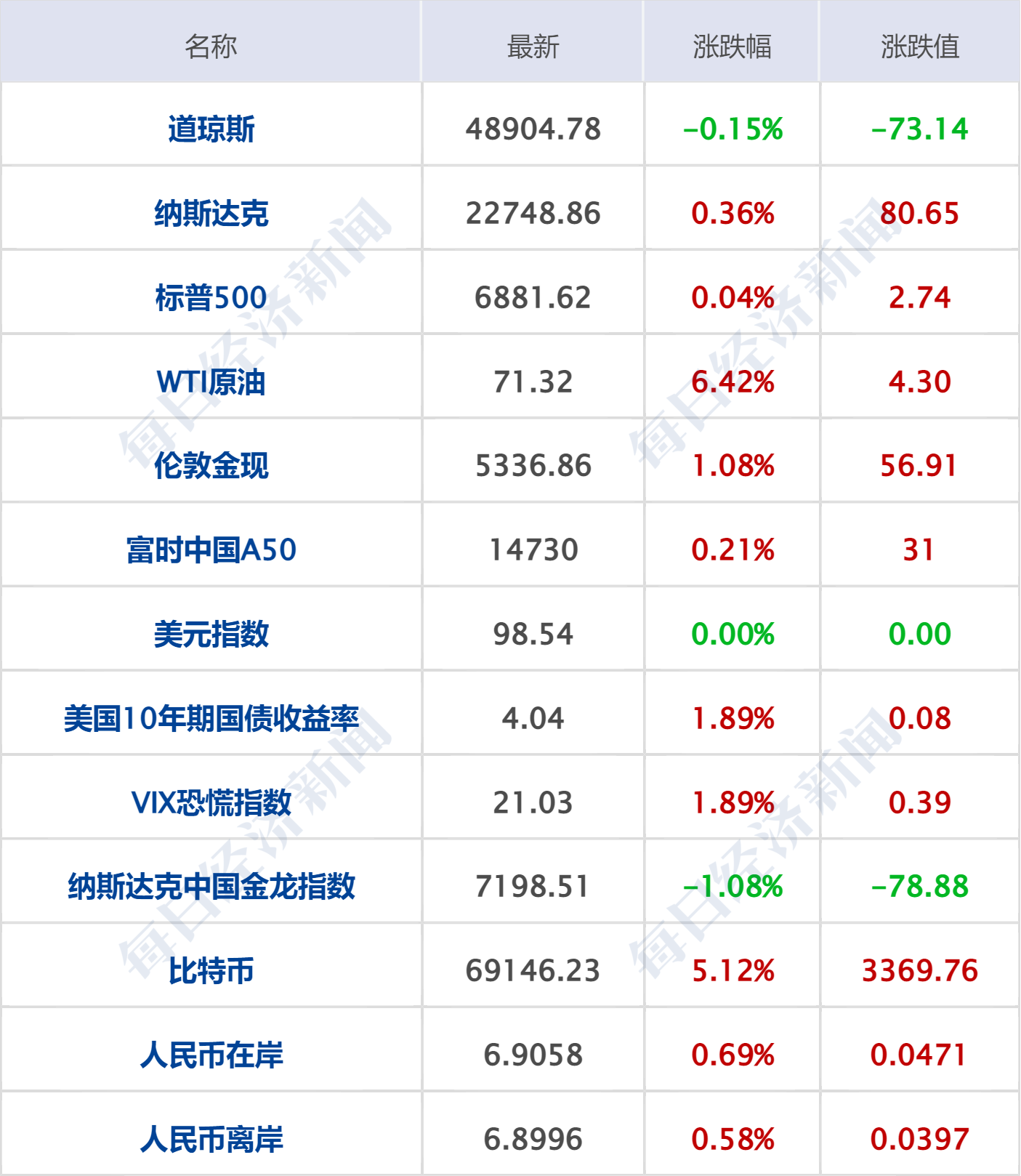 美股三大指数收盘涨跌不一,道指跌0.15%,标普500指数涨0.04%,纳指涨0.36%。大型科技股多数上涨,英伟达涨约3%,微软涨超1%,苹果、特斯拉、奈飞、Meta小幅上涨;谷歌跌超1%,英特尔、亚马逊小幅下跌。美股加密货币概念股走高,Figure涨超17%,Circle涨超15%,Strategy涨超6%。中概股多数下跌,纳斯达克中国金龙指数跌1.08%,金山云跌近5%,再鼎医药跌超4%,唯品会跌逾3%,奇富科技涨超5%,贝壳涨逾2%,禾赛科技涨近2%。