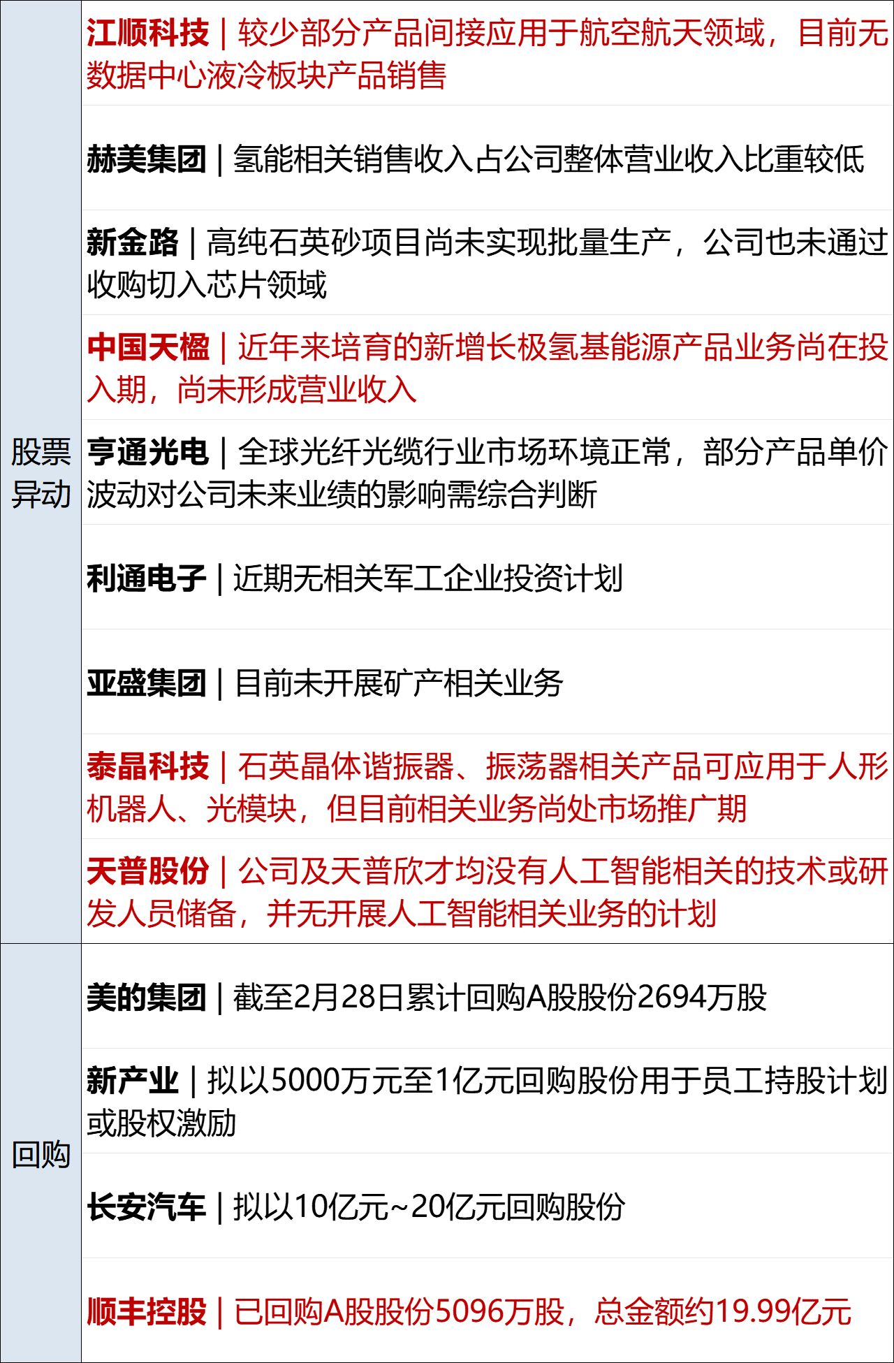 格力电器(SZ000651,股价37.2元,市值2084亿元):3月2日,针对近期网络上传闻称“格力电器未来每年将不再派发股息”,格力电器最新回应称,公司重视投资者回报,积极通过现金分红或股份回购等方式回报投资者,分红及回购金额均位于A股上市公司前列。公司未来分红安排将结合战略规划、经营业绩与资金状况综合研究确定。(证券时报)