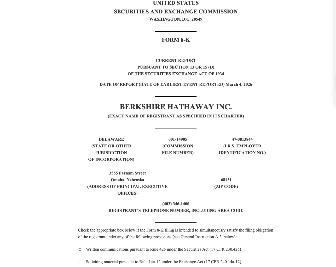 当地时间3月4日,伯克希尔·哈撒韦公告称,于3月4日正式重启普通股回购计划,这是自2024年以来该公司首次恢复回购自身股票。