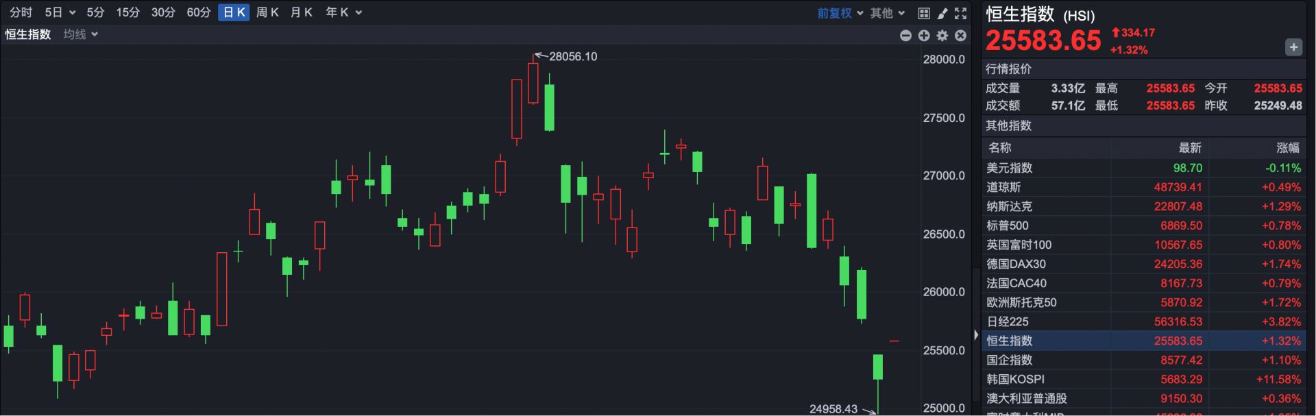 截至发稿,恒生指数开盘报25583.65点,上涨334.17点,涨幅1.32%。