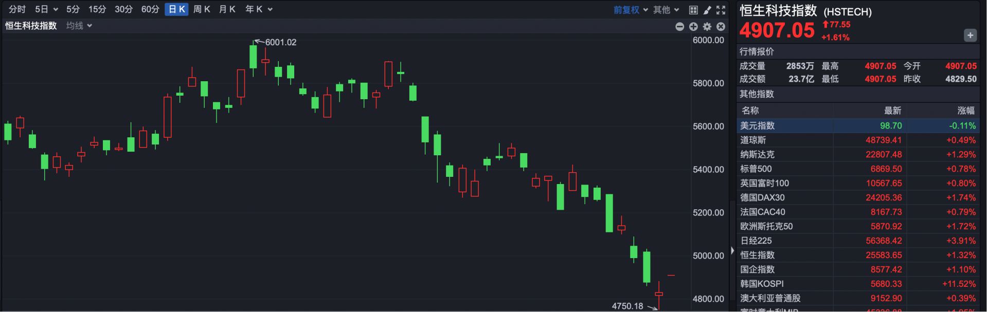 恒生科技指数开盘报4907.05点,上涨77.65点,涨幅1.61%。