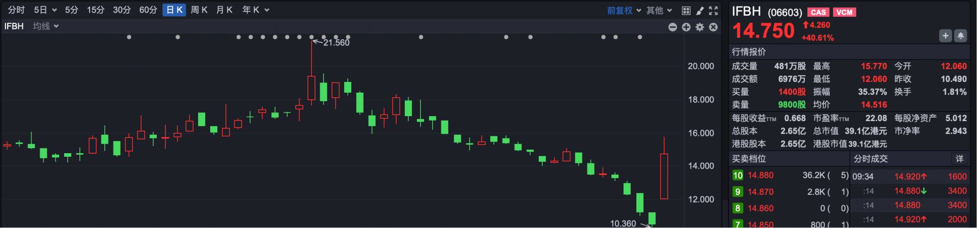 IFBH于去年6月30日在港交所上市,发行价为27.8港元,上市后短暂涨至48.8港元,但随后开启持续下跌走势,并大幅跌破发行价。截至昨日,该股最低跌到10.36港元。