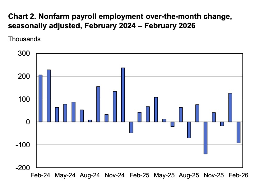 美国劳工部劳工统计局(BLS)周五发布的就业报告显示,2 月非农就业人数减少9.2万人,市场预期增加5.9万人;1月数据经下修后为增加12.6万人。与此同时,平均时薪环比增长0.4%,与1月增速持平,高于市场预期的0.3%。劳动力参与率降至62.0%,为2021年12月以来最低水平。家庭调查就业人数减少18.5万人,这是失业率从1月4.3%升至4.4%的主要原因。
