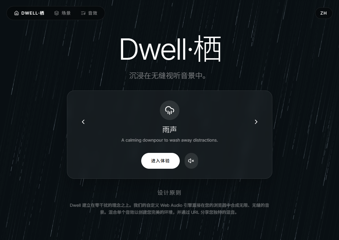 最近在想,如果只是想要获得一些白噪音,最好的去处是哪里呢?假如打开视频平台,不停摆弄,最后可能迷失在算法推荐的洪流中,却得不到真正想要的。于是我开发了 dwell,中文名叫做栖,提供开箱即用的环境音场景。用简单的音画营造出沉浸式的白噪音场景,让你的世界安静下来。