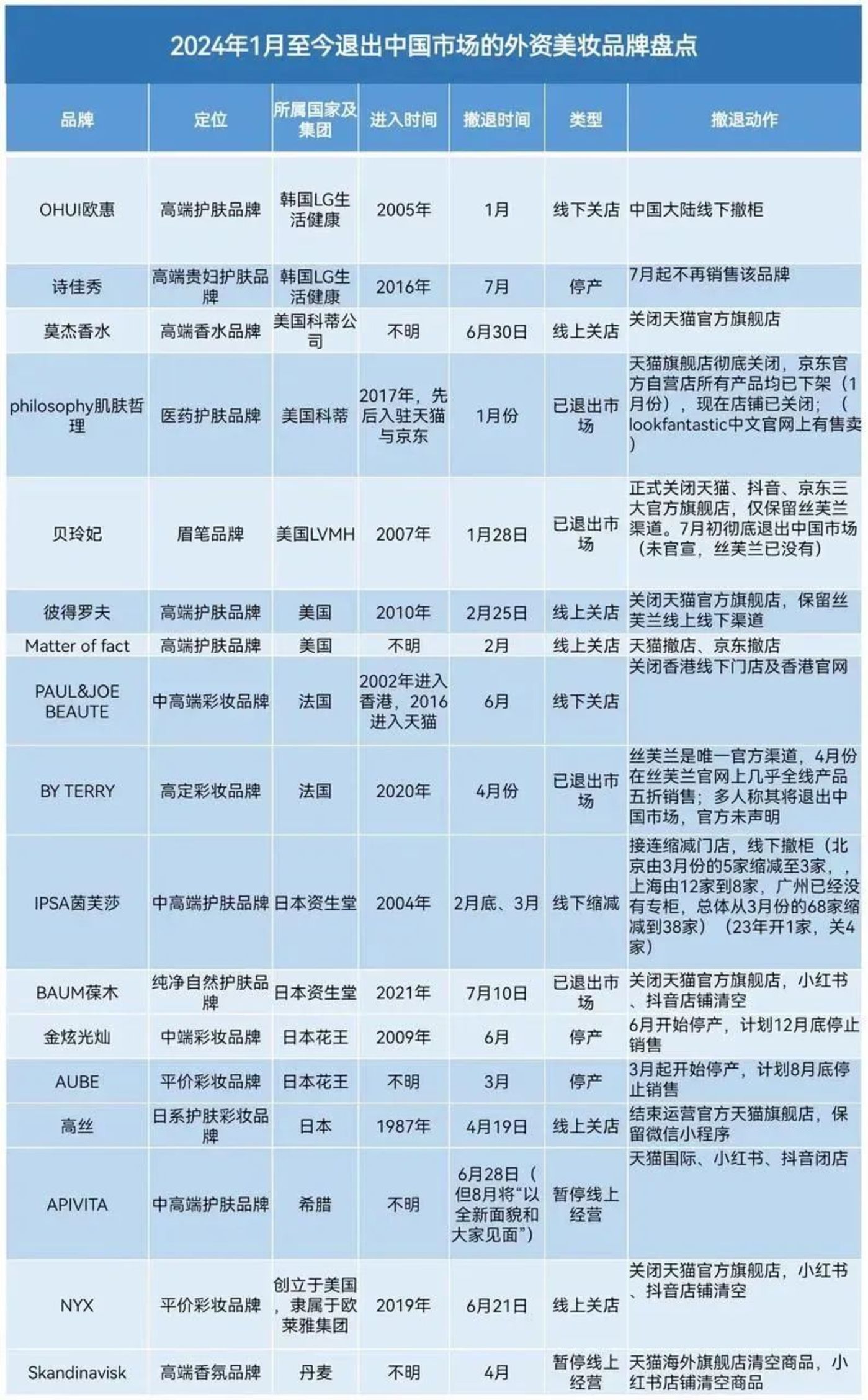 据《联商网》不完全统计,2024 上半年有 24 个美妆品牌关闭,截至 7 月底已有 17 家外资美妆品牌撤离中国市场。其中不乏贝玲妃,茵芙莎,欧惠,肌肤哲理等此前耳熟能详的品牌,撤离中国市场的方式大多是线下专柜撤离,线上各渠道关店。