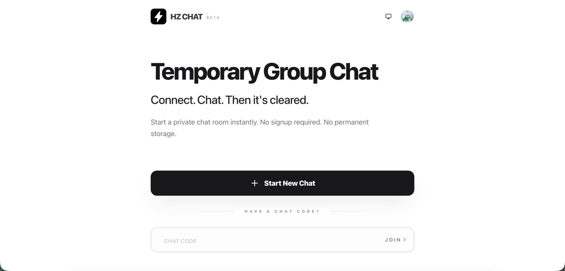 - 非持久化设计。HZ Chat 的聊天室和消息不会长期保存,交流结束后信息自然消失,让临时沟通保持轻量和干净。
