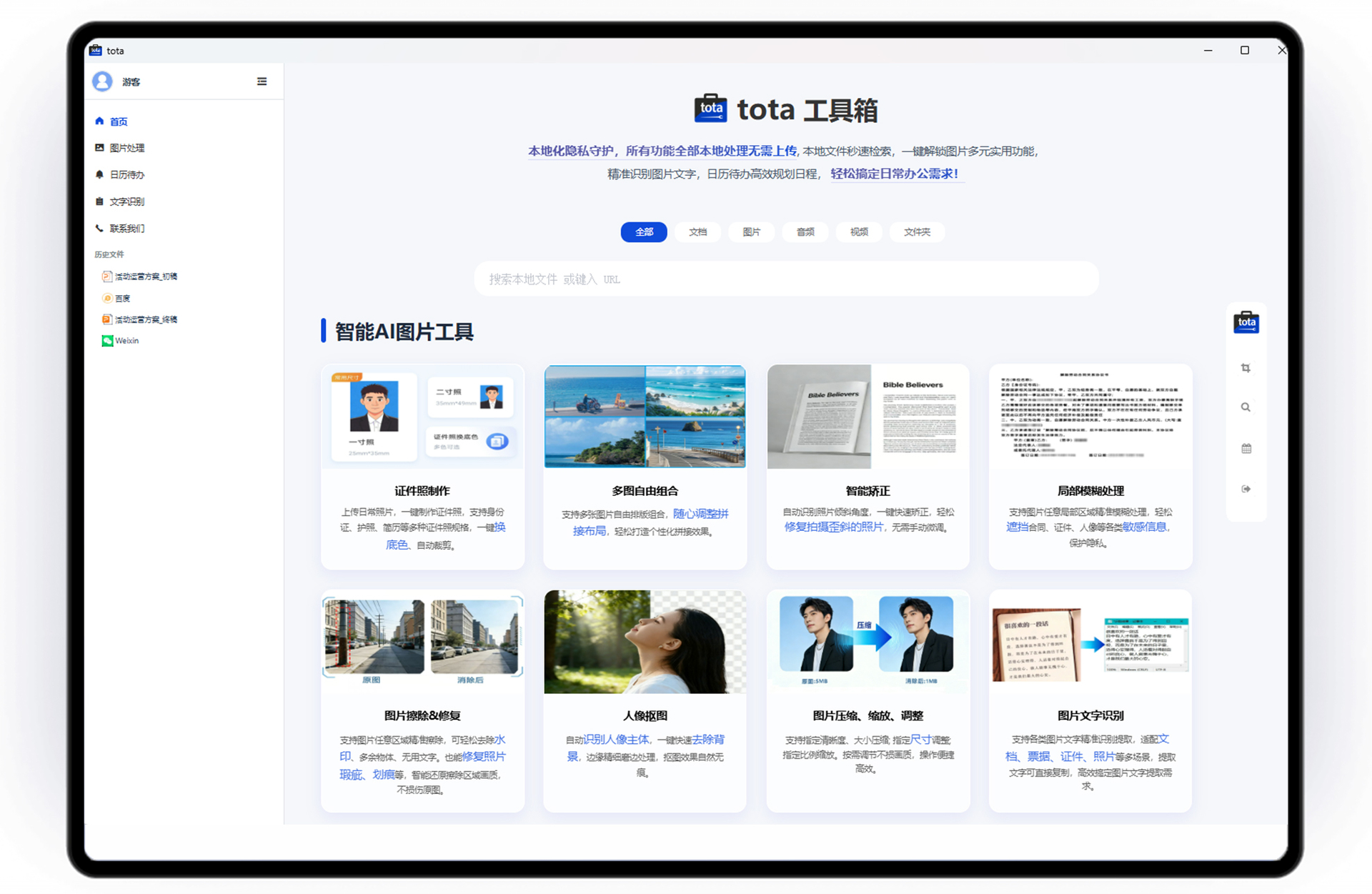 - 图片全场景处理:人像抠图(无痕边缘)、多规格证件照制作(一键换底裁剪)、多图自由拼接;去水印 / 去噪点 / 照片修复 / 无关事物擦除,局部模糊遮挡敏感信息;图片压缩 / 尺寸修改 / 智能矫正,按需调节不损画质