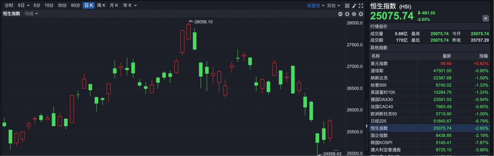 截至发稿,恒生指数开盘报25075.74点,下跌681.55点,跌幅2.65%。