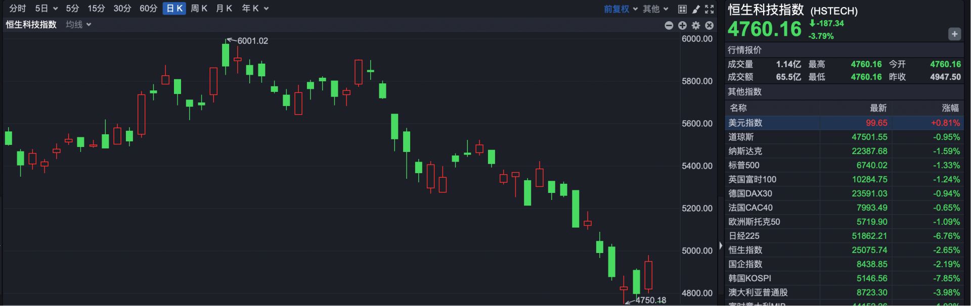 恒生科技指数开盘报4760.16点,下跌187.34点,跌幅3.79%。