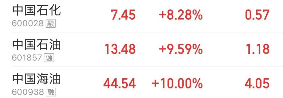 油气板块集体高开,“三桶油”大涨,中国海油涨停,中国石油上涨9.59%,中国石化涨超8%,中曼石油、山东墨龙、准油股份竞价涨停,科力股份、通源石油、潜能恒信、凯添燃气等高开超10%。