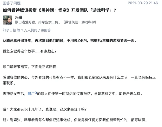 2021年,CEO冯骥在知乎发文,确认腾讯投资了游戏科学。