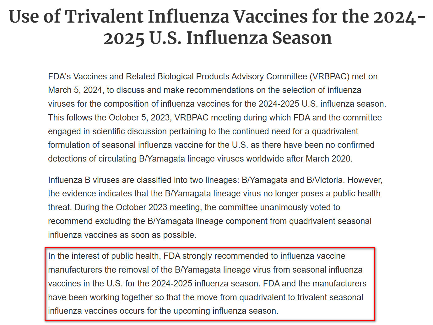 记者也注意到,2024年3月5日,FDA官网发布《2024—2025年美国流感季三价流感疫苗的使用》,称强烈建议流感疫苗制造商在2024—2025流感季从美国季节性流感疫苗中去除B/Yamagata系毒株,即将到来的流感季节将四价流感疫苗转变为三价疫苗。