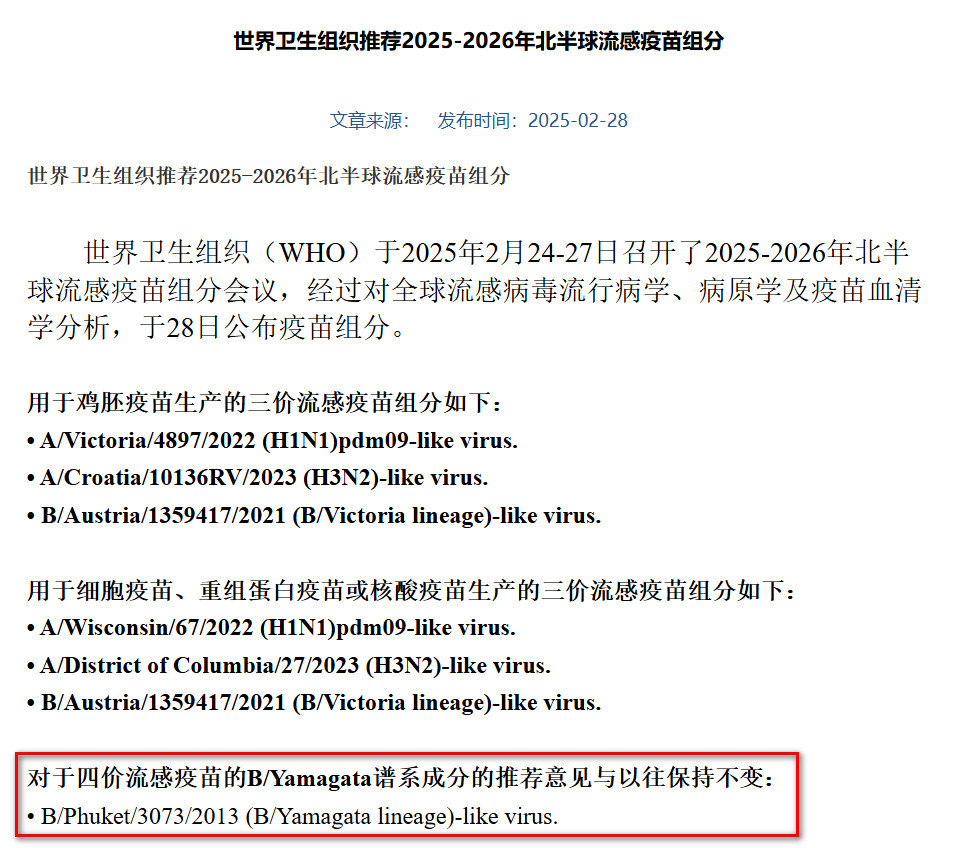 实际上,在去年11月中国疾控中心发布的《中国流感疫苗预防接种技术指南(2025—2026)》里,也提到了B/Yamagata系毒株已多年无全球自然流行,以及WHO认为将其纳入四价流感疫苗组分并非必要的态度。