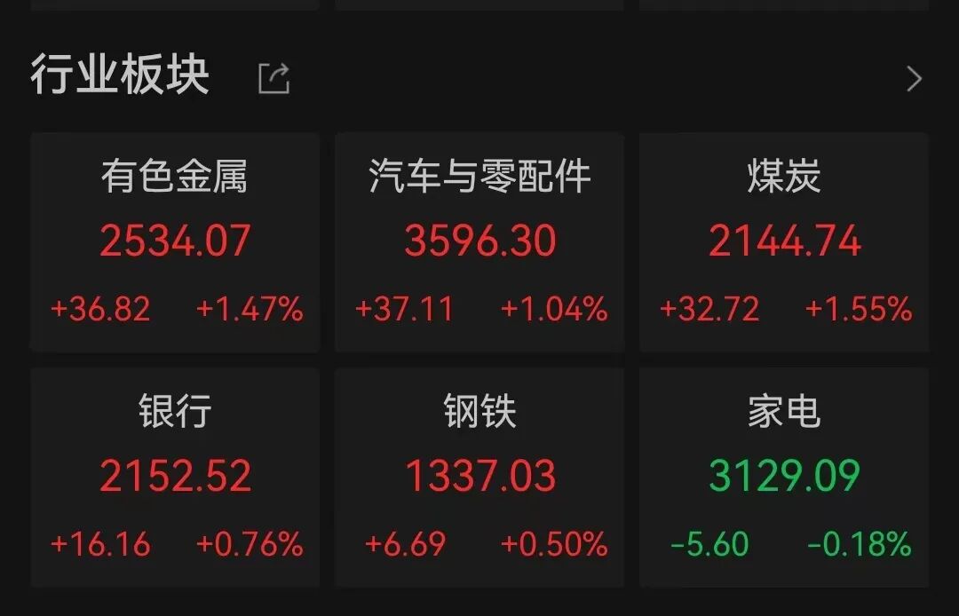 板块方面,有色金属、汽车与零配件、煤炭、银行股涨幅居前。家电股跌幅居前。