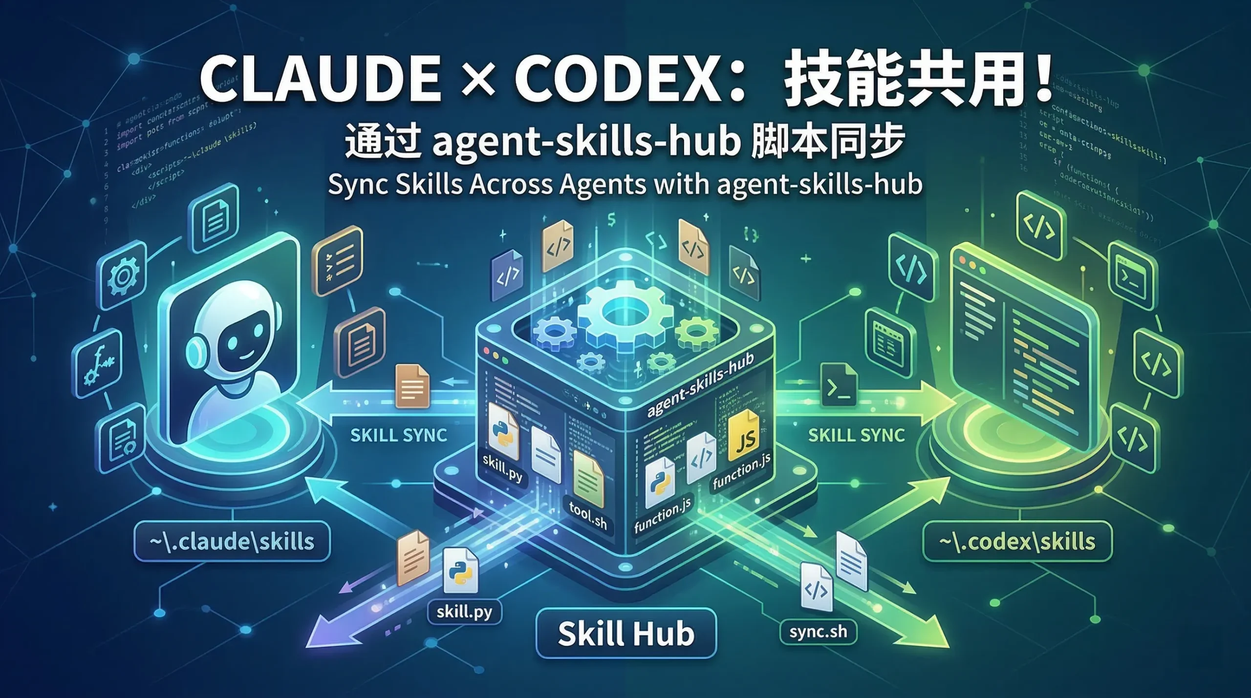 简单来说,agent-skills-hub 提供了一个”中央仓库”的概念。所有 Skill 统一安装到 ~/.skill-hub 这个目录,然后通过同步命令一键分发到各个 Agent 的技能目录中。这样做的好处显而易见:只需要维护一份技能包,所有 Agent 共享同一套 Skill,再也不用重复安装了。