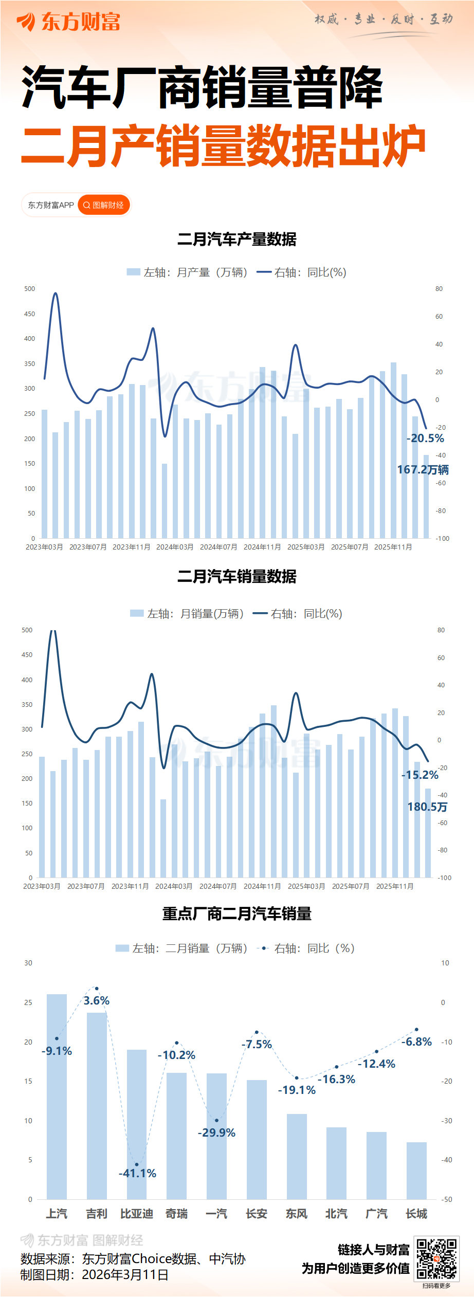 中汽协数据显示,2月汽车产销分别完成167.2万辆和180.5万辆,环比分别下降31.7%和23.1%,同比分别下降20.5%和15.2%。