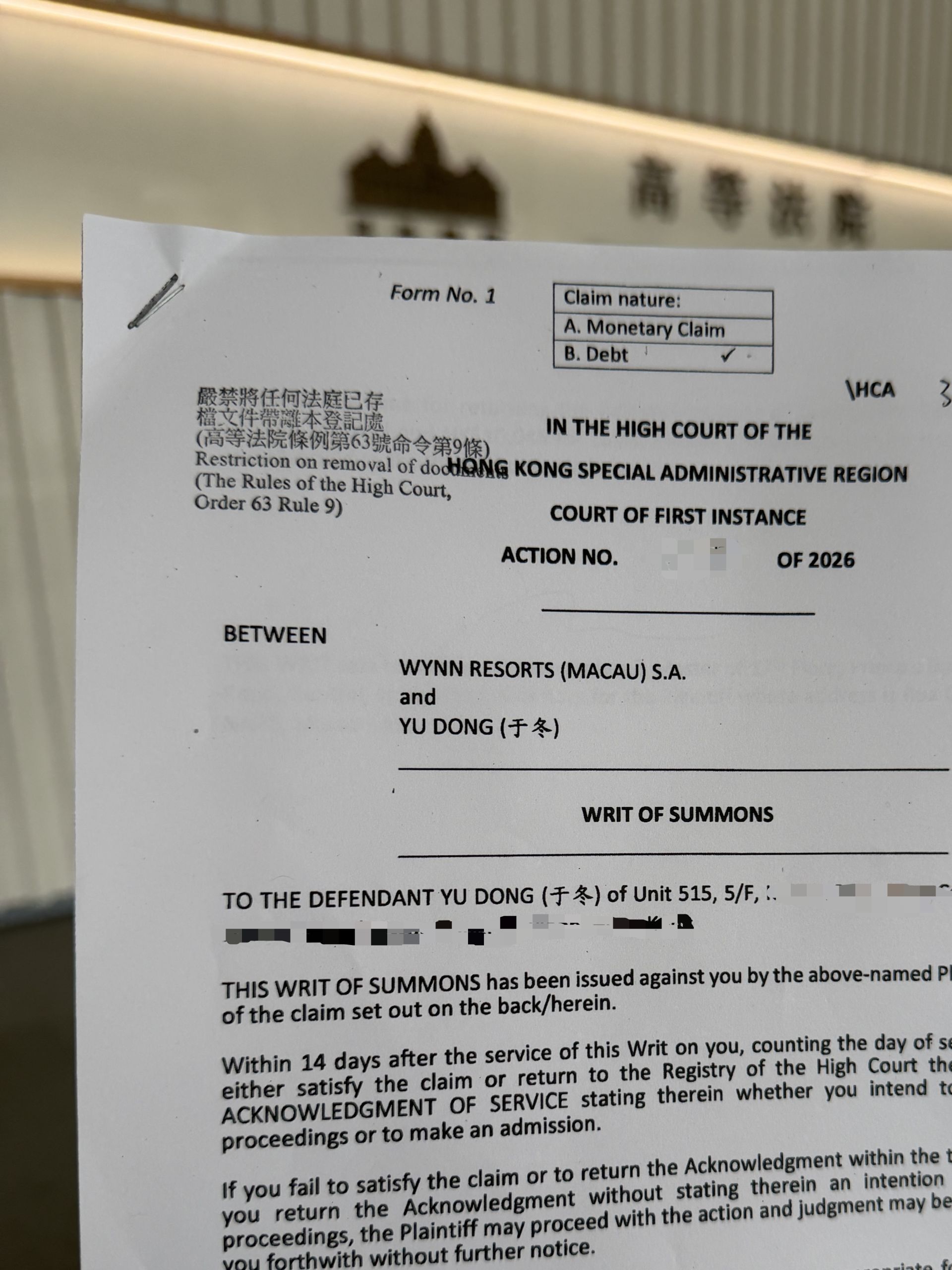 3月10日,《每日经济新闻》记者从香港高等法院获取的一份起诉书显示,在不久前的3月3日,永利度假村(澳门)股份有限公司(以下简称永利澳门)的确已向香港高等法院起诉了博纳影视娱乐有限公司(以下简称博纳影视娱乐)董事于冬。