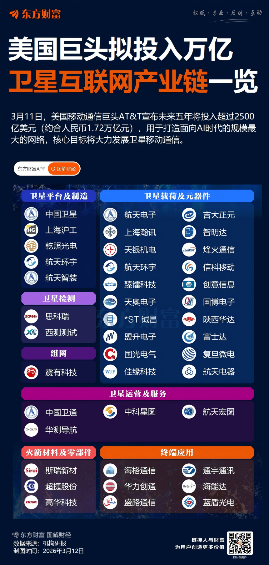 3月11日,美国移动通信巨头AT&T当地时间周二宣布未来五年将投入超过2500亿美元(约合人民币1.72万亿元),用于打造面向AI时代的规模最大的网络,AT&T将加速在美国城市、郊区和乡村地区部署无线和卫星网络、固网。新一轮2500亿美元投资的核心目标凸显出将大力发展卫星移动通信。AT&T表示将与AST SpaceMobile卫星合作将把网络覆盖范围扩展到偏远地区。借助与AST SpaceMobile的合作,AT&T将构建一种“天地并行”的网络架构,意味着卫星通信有望成为保障全域范围“全天候连接”的关键基础设施。