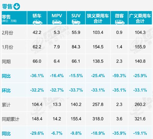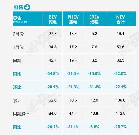 据乘联分会数据,2月,燃油乘用车国内零售销量为57万辆,同比下降19%;新能源乘用车零售销量为46.4万辆,同比下降32%。