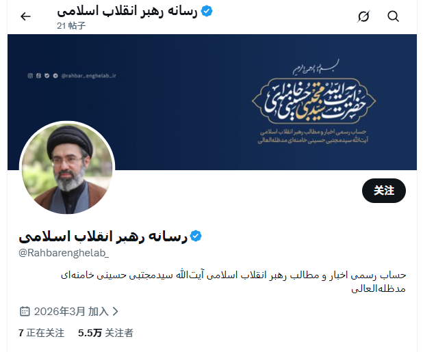 在美伊战火纷飞之际,伊朗新任最高领袖穆杰塔巴·哈梅内伊在埃隆·马斯克旗下颇具影响力的社交媒体平台X上新开了一个“蓝V认证账号”——@Rahbarenghelab_。