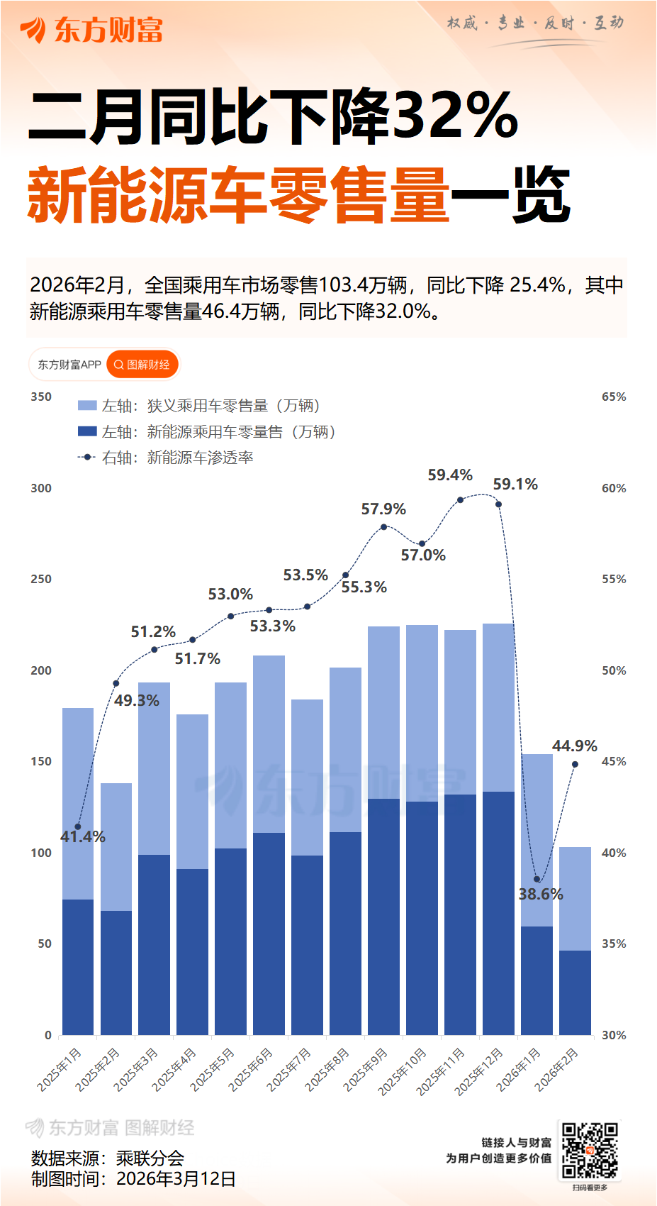 2月新能源乘用车市场零售46.4万辆,同比下降32.0%;1-2月新能源乘用车市场零售106.0万辆,同比下降25.7%。2月常规燃油乘用车零售57万辆,同比下降19%。