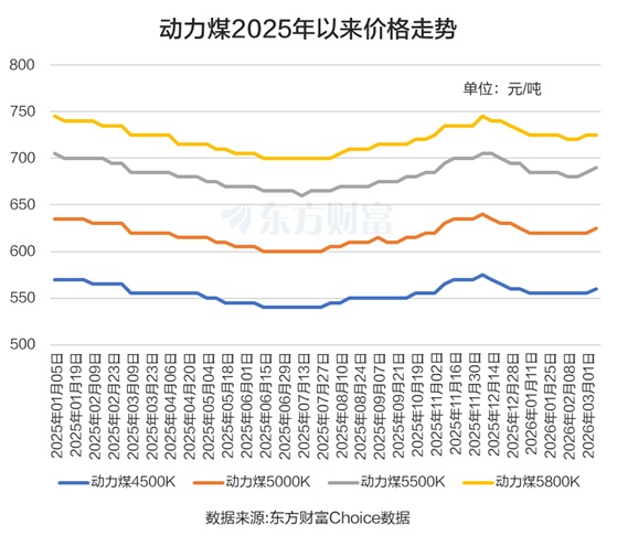 东方财富Choice数据显示,近期动力煤价格有明显的翘尾现象,其中动力煤5500K较为显著,截至3月8日当周价格为690元/吨,较2月中旬涨了10元/吨。
