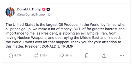“美国是目前世界上最大的石油生产国,所以当油价上涨时,我们能大赚一笔。” 特朗普周四在其自创的社交媒体平台“真实社交”上发文称。