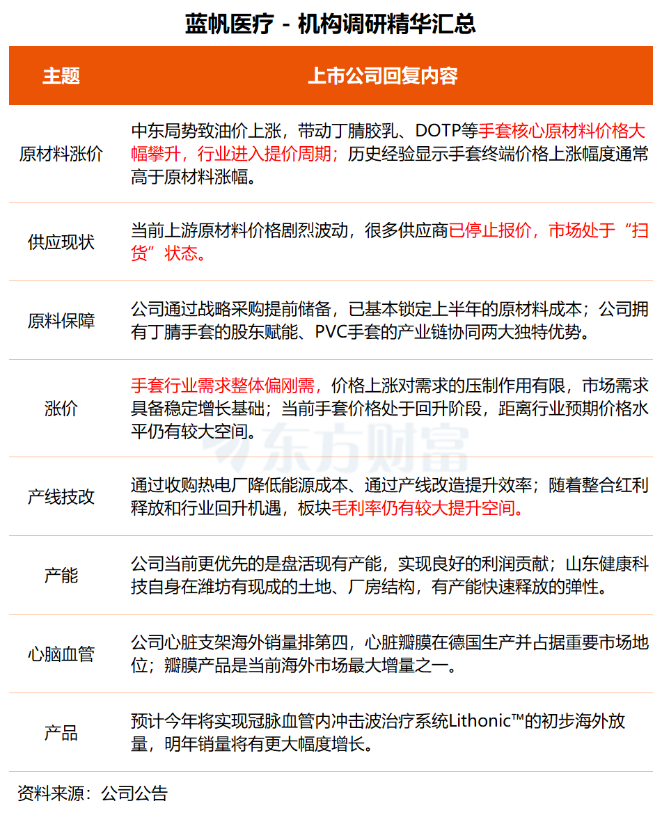 在调研中,蓝帆医疗表示,当前受国际地缘政治局势影响,原油价格上涨带动丁腈胶乳、DOTP、PVC糊树脂等手套核心原材料价格大幅攀升,行业进入提价周期,且历史经验显示,手套终端价格上涨幅度通常高于原材料涨幅。公司通过战略采购提前储备,已基本锁定上半年的原材料成本,同时关联方、产投方也将助力保障原材料稳定供应,公司健康防护事业部2026年业绩具备较大弹性。