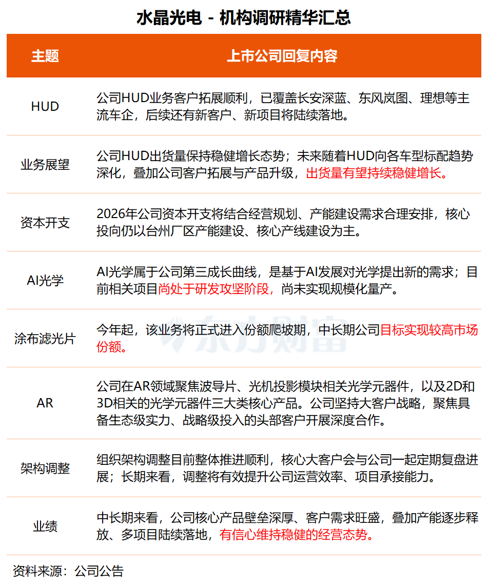 在调研中,水晶光电表示,公司HUD业务客户拓展顺利,已覆盖长安深蓝、东风岚图、理想等主流车企,后续还有新客户、新项目将陆续落地。未来随着HUD向各车型标配趋势进一步深化,叠加公司客户拓展与产品升级,公司HUD出货量有望持续维持稳健增长趋势。