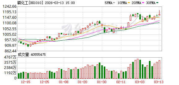 从K线图来看,磷化工自2025年以来加速上涨,其中2025年上涨47.04%,2026年以来已上涨24.04%(截至3月13日早盘收盘)。且3月13日早盘,磷化工指数再创历史新高。