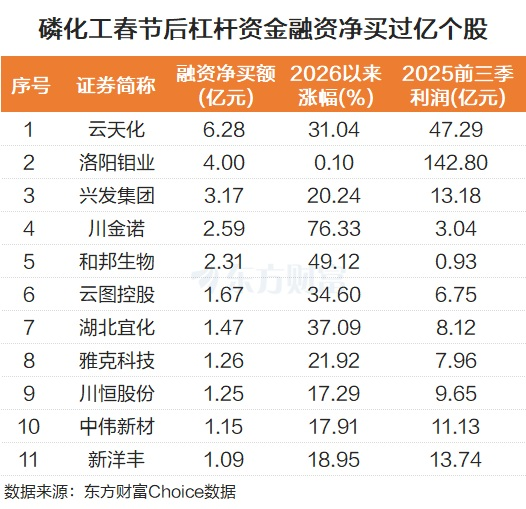 从个股角度来看,部分磷化工个股在春节假期后被杠杆资金积极抢筹。云天化被融资净买入6.28亿元,洛阳钼业被融资净买入4亿元,兴发集团被融资净买入3.17亿元。川金诺、湖北宜化、新洋丰等也被融资净买入过亿。