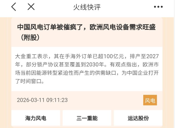 在每日经济新闻App私人订制的火线快评中,在3月11日开盘前就提到了风电板块,在周四,海力风电、三一重能大涨超10%。