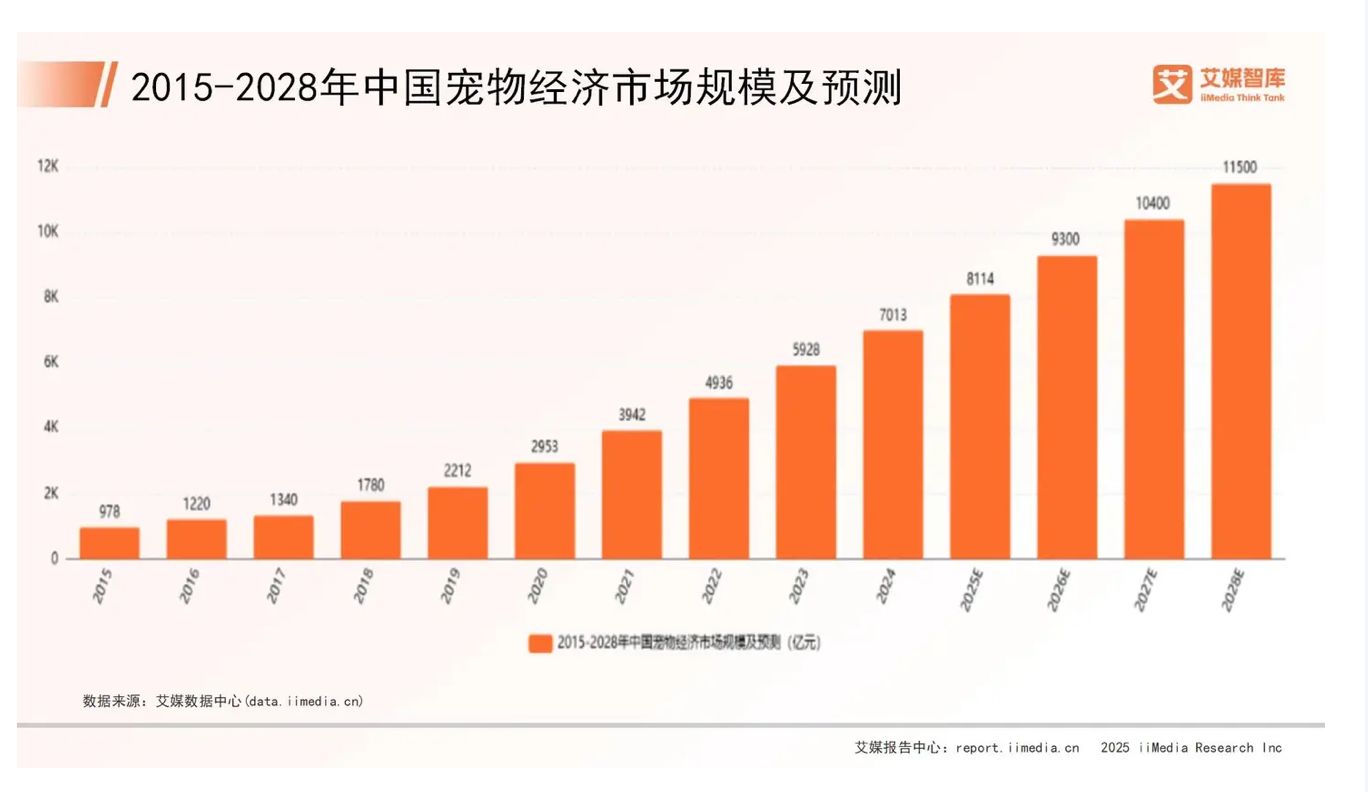 这种观念变化推动宠物行业快速扩张。艾媒咨询数据显示,中国宠物经济市场规模2015年为978亿元,到2024年已经增长至7013亿元,预计2026年将达到9300亿元。十年时间里,这一市场规模扩大接近十倍。