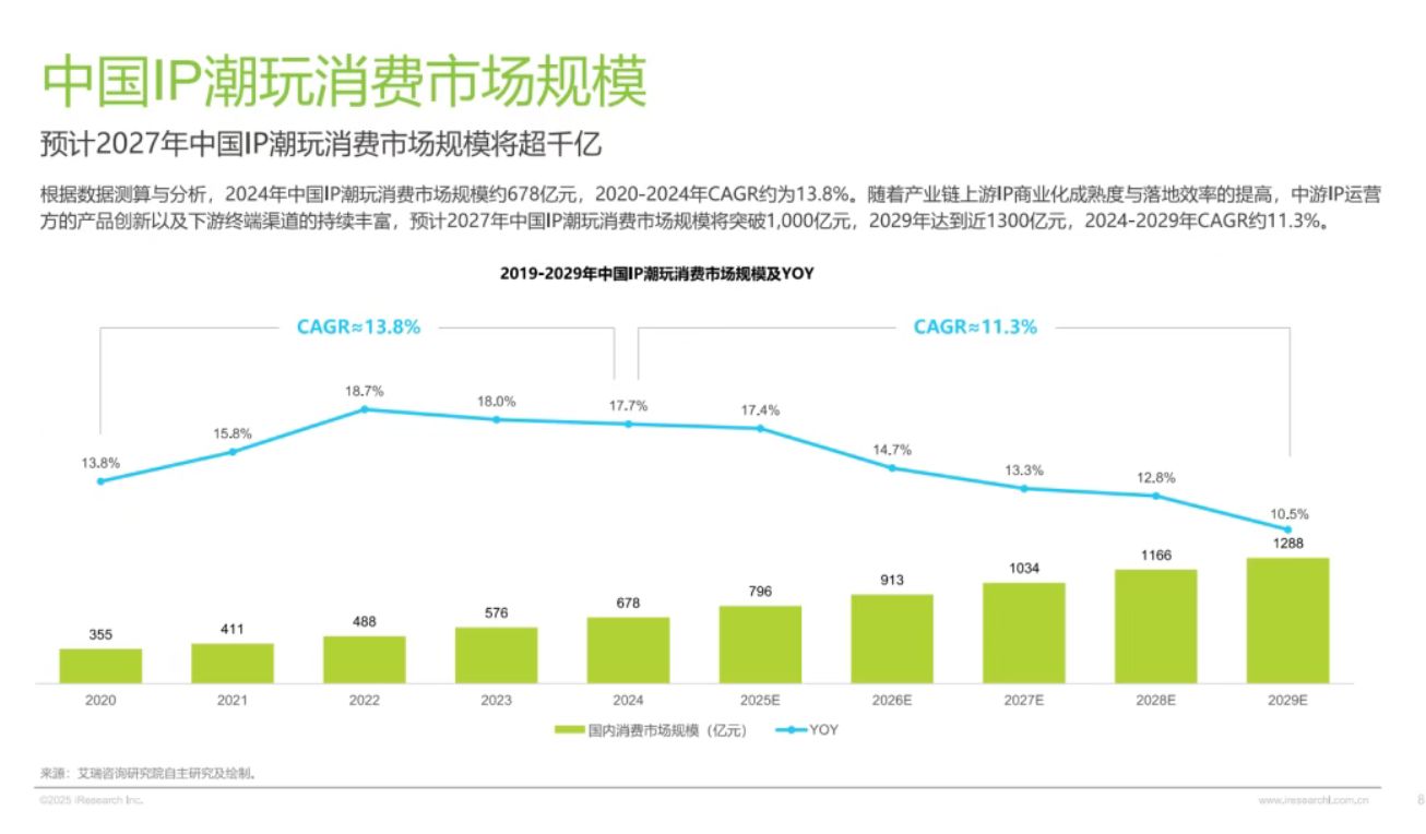 据艾瑞咨询测算,2024年中国IP潮玩市场规模达678亿元,2020年—2024年复合增长率13.8%;预计到2029年将逼近1300亿元。