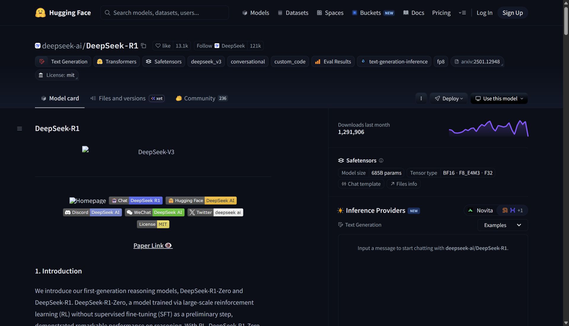 2025年1月20日,DeepSeek团队正式发布DeepSeek-R1推理模型,并第一时间将完整模型权重、技术文档同步开源至Hugging Face,这是它被全球发现的起点。
