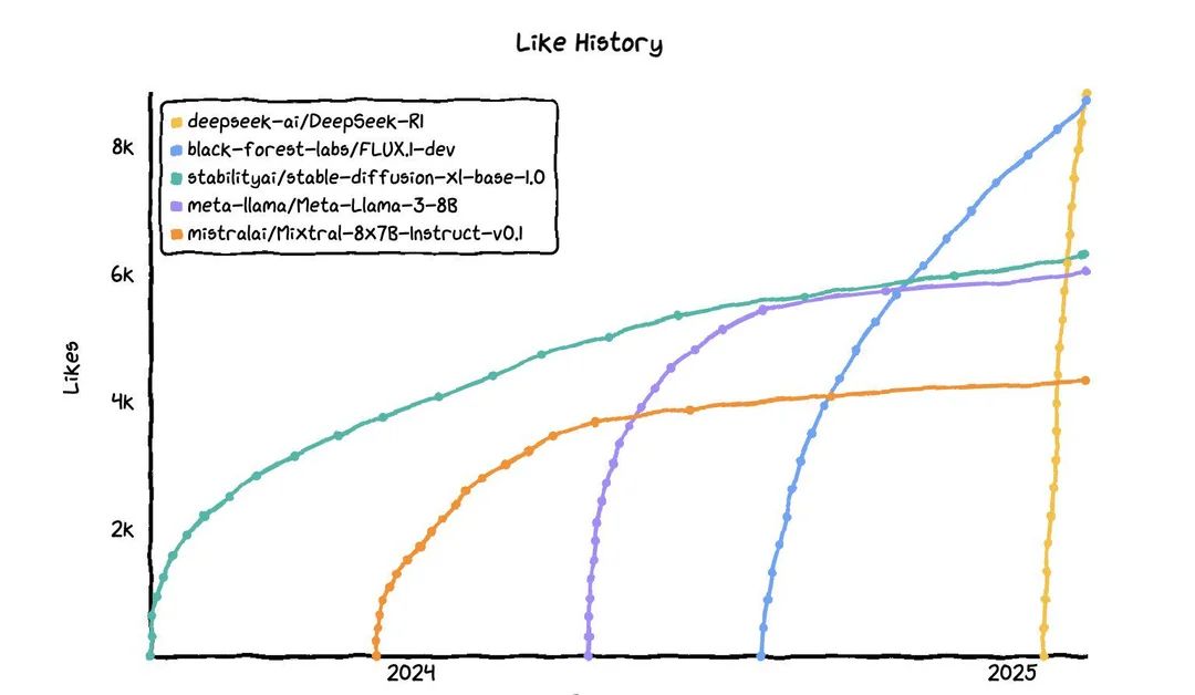 DeepSeek-R1凭借媲美头部闭源模型的推理能力,加上宽松开源协议、可完全复现的技术细节,瞬间抓住了Hugging Face社区核心用户的注意力。