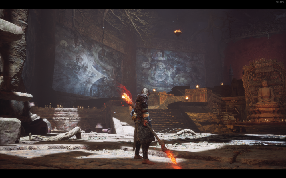 战斗当然是《黑神话:悟空》的亮点,但不是唯一的亮点。你想一路boss rush过去,游戏主美杨奇不答应,游戏音乐制作人翟锦彦不答应,每一个场景和沿途的小妖怪都不答应,不是因为他们会给你上难度,而是会用出色的音乐和美术留住你的脚步:一座1:1复刻的大佛塑像,一幅尺寸巨大而精美的壁画,一段酣畅淋漓的国风BGM,都值得你反复观看品味。如果执着于赶路和战斗,会错过一些美好的东西。哪怕二周目再回来,也会永失初见的惊喜。