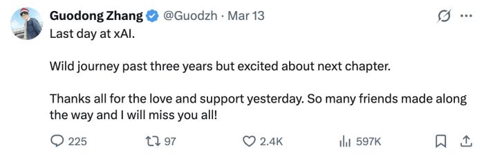 据Business Insider援引知情人士称,联合创始人戴子航也已离开xAI,他的xAI徽章已从其xAI个人资料中消失。