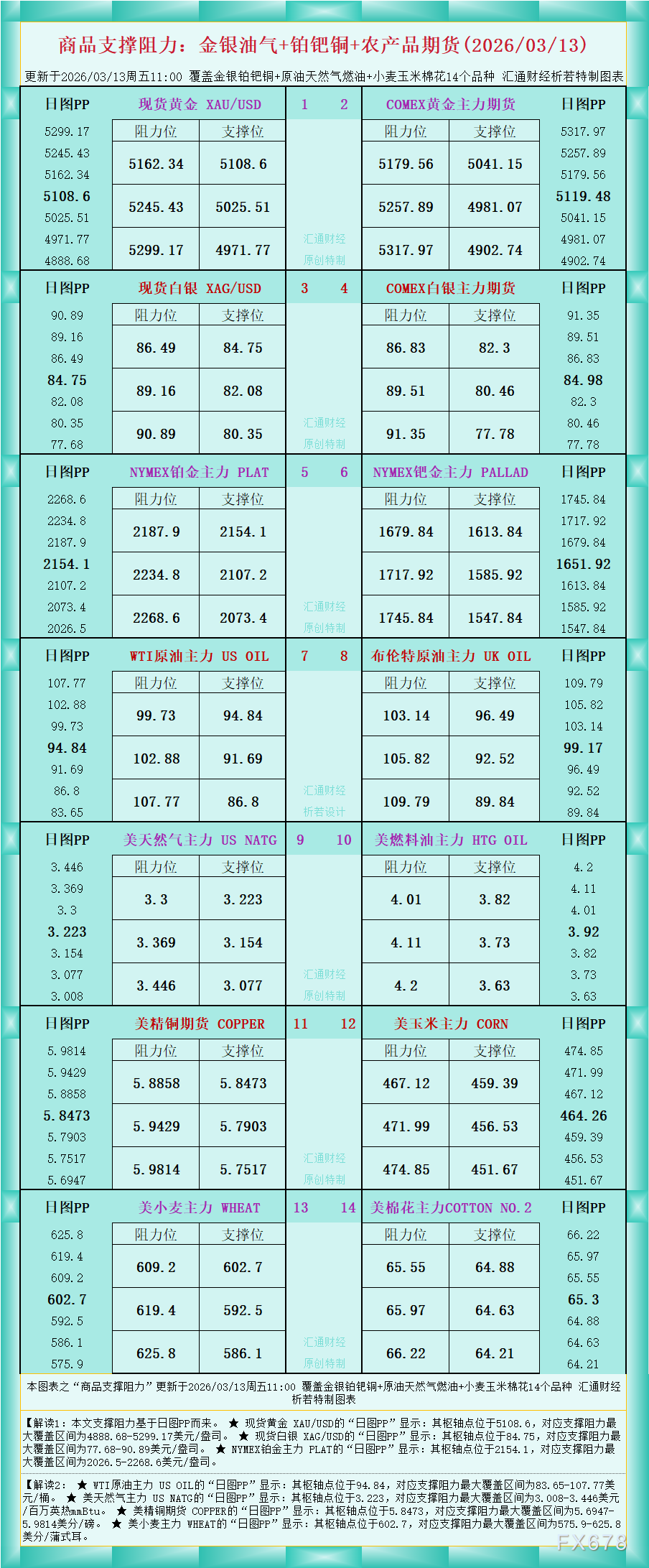 一张图看商品支撑阻力:金银油气+铂钯铜+农产品期货,更新于2026年3月13日周五11:00,具体覆盖金银铂钯铜+原油天然气燃油+小麦玉米棉花14个品种,更多详见汇通财经析若特制图表中的内容。