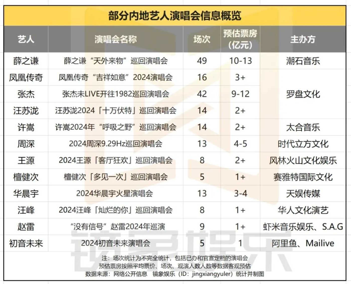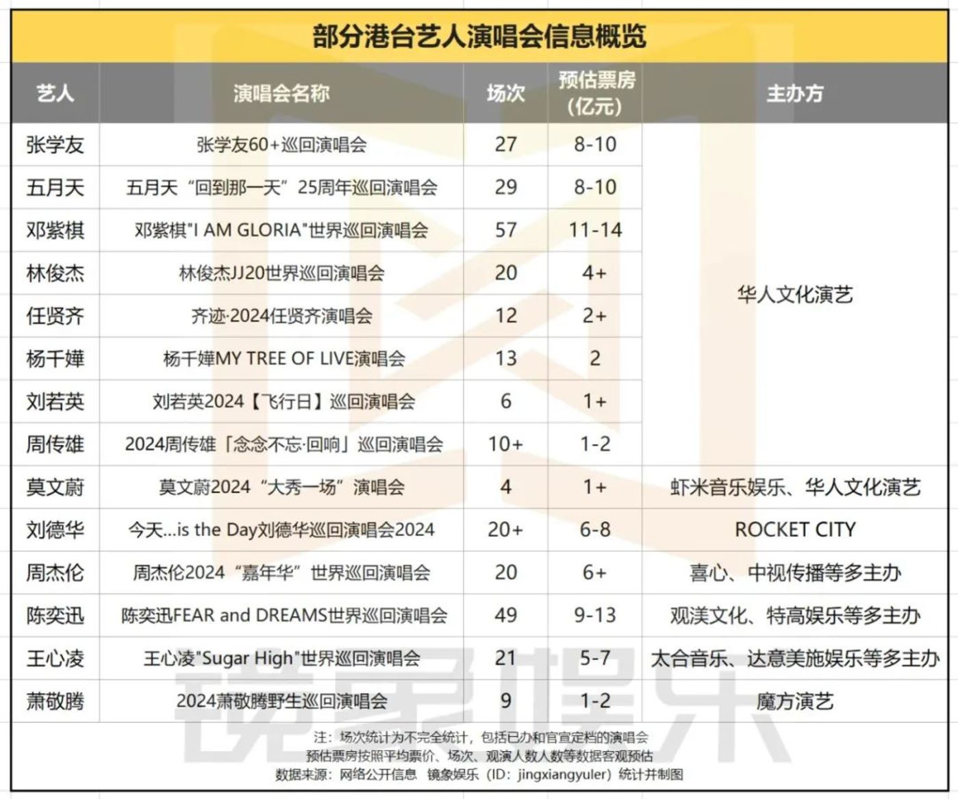 在这个过程中,头部艺人多走的是巡回演唱会的模式,能否覆盖到全国足够多的站点,考验的就是主办方的实力。华人文化演艺能够承接多位港台艺人的演唱会,也在于此。