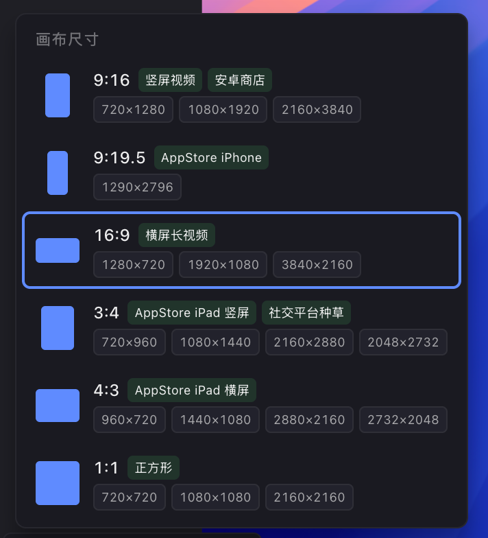 6、支持各种画布比例,AppStore、安卓应用商店、社交媒体种草等