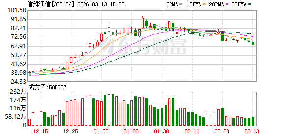 作为国内泛射频领域及商业航天赛道双龙头,信维通信此前凭借SpaceX概念加持、商业卫星订单落地,43个交易日股价便从28元,快速上涨至94元,实现翻三倍涨幅。1月下旬以来,信维通信股价回调,截至3月13日收盘,跌4.35%报64.13元/股,已回调三成。