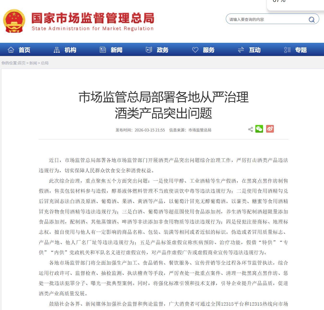 3月15日晚间,国家市场监督管理总局网站发文称,近日,总局部署各地市场监管部门开展酒类产品突出问题综合治理工作,严厉打击酒类产品违法违规行为。