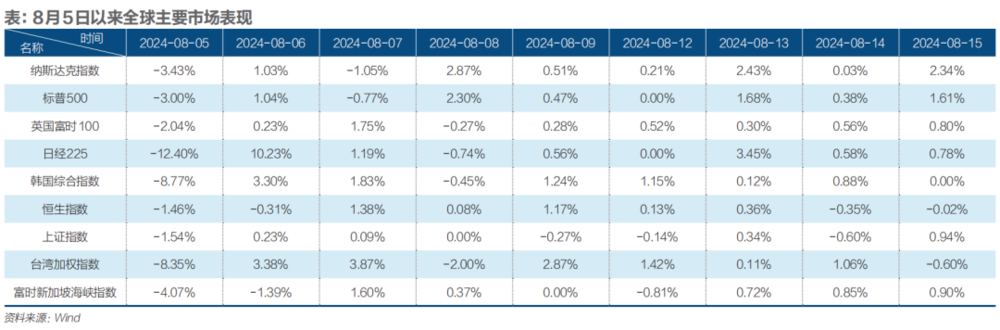 不过,在各国市场监管层积极表态、套利交易仓位降低、美国方面积极数据信号发布之后,市场的恐慌情绪日前已逐步修复。截至8月21日,日经225、韩国综合指数等市场指数经历巨震后已反弹至接近8月初的水平。