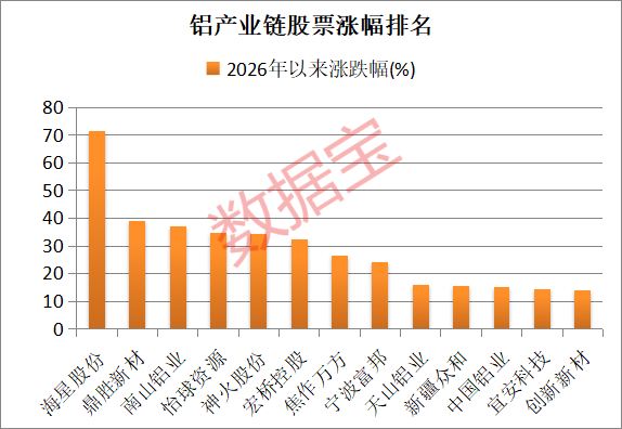 A股市场铝产业链股票合计31只,截至3月13日收盘,股票合计A股市值为1.24万亿元。据证券时报·数据宝统计,今年以来,铝产业链股票平均上涨13.58%,跑赢同期上证指数10个百分点以上。海星股份、鼎胜新材、南山铝业、怡球资源、神火股份、宏桥控股6股累计涨幅均超30%。