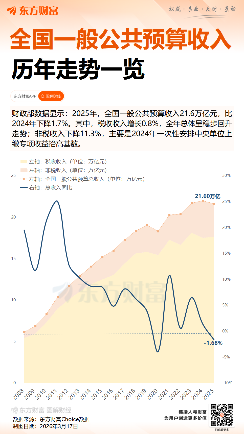 2025年,全国一般公共预算收入21.6万亿元,比2024年下降1.7%。其中,税收收入增长0.8%,全年总体呈稳步回升走势;非税收入下降11.3%,主要是2024年一次性安排中央单位上缴专项收益抬高基数。分税种看,国内增值税增长3.4%,全年保持平稳增长;国内消费税增长2%,主要是卷烟、成品油消费税增长带动;企业所得税增长1%,主要是制造业企业所得税增长带动。分行业看,装备制造业、现代服务业等行业税收表现良好。计算机通信设备制造业税收收入增长13.5%,电气机械器材制造业税收收入增长8%,科学研究技术服务业税收收入增长14.3%,文化体育娱乐业税收收入增长7.5%。