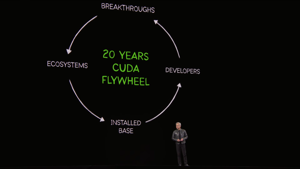 在演讲开头,黄仁勋指出,今年是英伟达CUDA架构诞生20周年。黄仁勋表示:“我们花了20年时间,在全球构建了数亿台运行Cuda的GPU和计算系统。我们渗透到每一个云端,渗透到每一家计算机公司。我们几乎服务于所有行业。”
