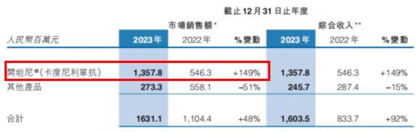 基于双抗药物的放量,康方生物业绩也迎来了暴涨时代。2023年总收入为45.26亿元,同比增长达440%,其中开坦尼(PD-1/CTLA-4)2023年销售额为13.58亿元,占产品总销售额83%,不仅抵消了其他产品51%的销售额下滑,还为总销售额带来高达48%的正增长。