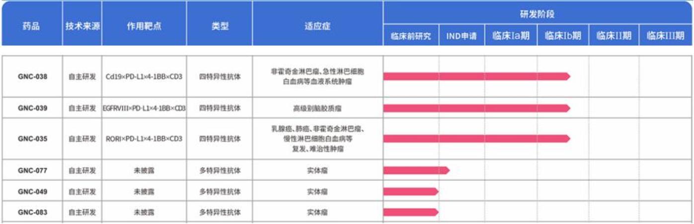 既然双抗能成药,那么多抗理论上也行得通,百利天恒除了在研的SI-B001、SI-B003等双抗外,又开发了GNC-038、GNC-039和GNC-035等3款全新机制创新药,目前均已进入Ⅰ期临床试验阶段,该3款新药是全球前3个进入临床研究阶段的四体分子,此外,还有3款未披露靶点的多抗药物处于临床前阶段。